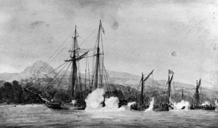 | Keywords: blackandwhite monochrome outdoor black and white On 8 April 1823, the barges USS Mosquito and USS Gallinipper chased the pirate schooner, Pilot, off Havana, Cuba. Driving the vessel ashore, the ensuing battle resulted in two pirate fatalities and with one being captured. The other pirates escaped on shore where Marines landed to pursue them. The engagement was supported by sloop-of-war Peacock. United States barges Gallinipper and Mosquito destroy piratical boats off the Cuban coast, 8 April 1823. Artwork by Warren. In April, the barges chased a pirate schooner and barge into the bay and subsequently killed all but five of the seventy-odd men they engaged. Courtesy of the Mariner’s Museum, Bailey Collection, #423. NHHC Photograph Collection, NH 56708. On 8 April 1823, the barges USS Mosquito and USS Gallinipper chased the pirate schooner, Pilot, off Havana, Cuba. Driving the vessel ashore, the ensuing battle resulted in two pirate fatalities and with one being captured. The other pirates escaped on shore where Marines landed to pursue them. The engagement was supported by sloop-of-war Peacock. United States barges Gallinipper and Mosquito destroy piratical boats off the Cuban coast, 8 April 1823. Artwork by Warren. In April, the barges chased a pirate schooner and barge into the bay and subsequently killed all but five of the seventy-odd men they engaged. Courtesy of the Mariner’s Museum, Bailey Collection, #423. NHHC Photograph Collection, NH 56708. |