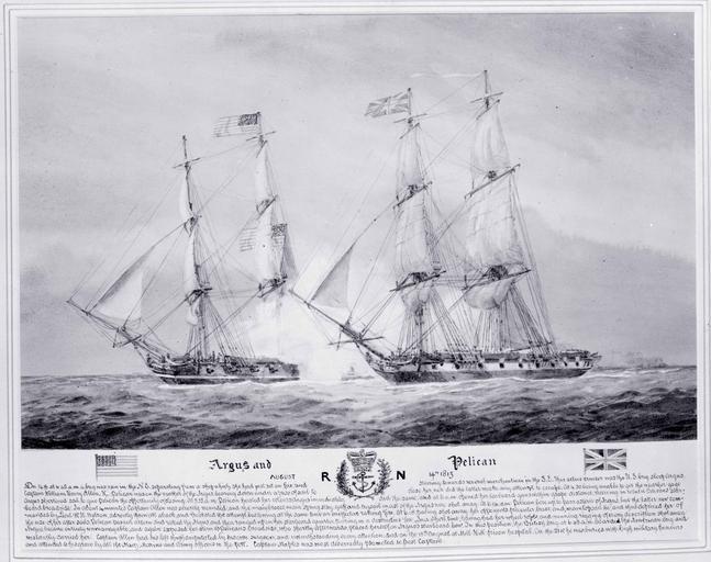 Keywords: monochrome photo border drawing sketch outdoor blackandwhite black and white On 14 August 1813, during early morning, the brig Argus, commanded by William H. Allen, and HMS Pelican battled off England's coast. In the course of the engagement, Allen became wounded and remained at station until fainting. Shooting quickly, the British then broadsided Pelican numerous times and was just about to board the vessel when Argus struck her colors and surrendered. During battle, she lost 10 men, including Allen with 13 others wounded. Capture of USS Argus, commanded by Commander William.H. Allen, by HMS Pelican, Captain J.F. Maples, 14 August 1813. Watercolor attributed to Warren. Water color by an unknown English Artist, NH 56759. On 14 August 1813, during early morning, the brig Argus, commanded by William H. Allen, and HMS Pelican battled off England's coast. In the course of the engagement, Allen became wounded and remained at station until fainting. Shooting quickly, the British then broadsided Pelican numerous times and was just about to board the vessel when Argus struck her colors and surrendered. During battle, she lost 10 men, including Allen with 13 others wounded. Capture of USS Argus, commanded by Commander William.H. Allen, by HMS Pelican, Captain J.F. Maples, 14 August 1813. Watercolor attributed to Warren. Water color by an unknown English Artist, NH 56759. |