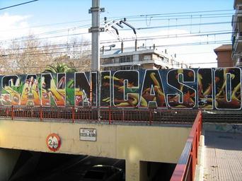 Keywords: Nicasio23.jpg es Mural en la tapia que delimita la vía del ferrocarril de cercanías C-5 en la salida del barrio de San Nicasio Leganés Comunidad de Madrid own Chaluco San Nicasio Leganés Rail transport in Leganés