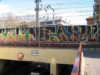 Keywords: Nicasio26.jpg es Mural en la tapia que delimita la vía del ferrocarril de cercanías C-5 en la salida del barrio de San Nicasio Leganés Comunidad de Madrid own Chaluco San Nicasio Leganés Rail transport in Leganés