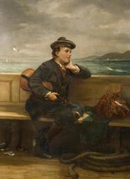 | Keywords: Nicholas Chevalier, Seeking Fortune, oil on canvas.jpg Artwork creator Nicholas Chevalier Title Seeking Fortune In this work a young boy looks wistfully over the edge of the boat in which he is depicted His bundle is evidence of his leaving his violin is tucked under his arm and is perhaps obliquely referred to in the title 'Seeking Fortune' He wears a Scottish cap and is possibly leaving Glasgow In its addressing of the theme of emigration the work has much in common with Ford Madox Brown's The Last of England 1852-5 Exhibited for the first time in 1887 it has also been suggested that the painting depicts B L Farjeon a friend of the artist who in 1854 at age 16 left England for Australia 1887 oil on canvas Size object history exhibition history credit line accession number place of creation http //www europeana eu/portal/record/09405a/3B94BC8DF355032DA7A9643750619A94CF157559 html query Seeking+Fortune Vads PD-old-100 DEFAULTSORT Chevalier Nicholas Nicholas Chevalier 19th-century oil on canvas paintings 1880s paintings Oil paintings of boys Emigration in art 1887 Immigration in art People with musical instruments in art Paintings with signatures Males with watercraft 19th-century paintings location missing |