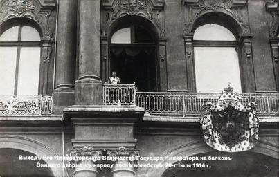 | Keywords: Nicholas II declaring war on Germany from the balcony of the Winter Palace.jpeg ru Выход Его Импе ато ского Величества Госуда я Импе ато а на балкон Зимнего дво ца к на оду после молебствия 20-го июля 1914 en Output of His Imperial Majesty Emperor on the balcony of the Winter Palace to the people after the litany of 20th July 1914 Julian 1914-08-02 1914-07-20 http //leb nlr ru/edoc/996/ http //brbl-dl library yale edu/vufind/Record/3601086 image_id 1000244 Romanov Family Album 3 Page 33 http //brbl-dl library yale edu/vufind/Record/3601086 image_id 1000246 Image no 2 author Custom license marker 2013 05 15 PD-RusEmpire Uploaded with UploadWizard Nicholas II of Russia in 1914 in photographs World War I origins Historical images of Winter Palace Romanov Family Album No 3 Photographs taken on 1914-08-02 |