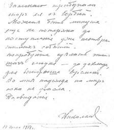 | Keywords: Nicholas II of Russia note 1914-07-14.png en The note from Nicholas II of Russia to his foreign minister S D Sazonov ru Письмо Госуда я Импе ато а иколая II минист у иност анных дел И Д Сазонову от 14 июля 1914 г own Incnis Mrsi date Image Nicholas II of Russia note 1914-07-14 jpg Evidently this is only the note's last page of 2 Text is <blockquote> Гаагскаго т ибунала спо ъ ея съ Се біей ожет быть минута еще не поте яна до наступленія уже неотв атимыхъ событій Поп обуйте сдѣлать этотъ шагъ сегодня до доклада для выиг ыша в емени Во мнѣ надежда на ми ъ пока не угасла До свиданія </blockquote> иколай 14 июля 1914 г World War I origins Nicholas II of Russia Cyrillic manuscripts |