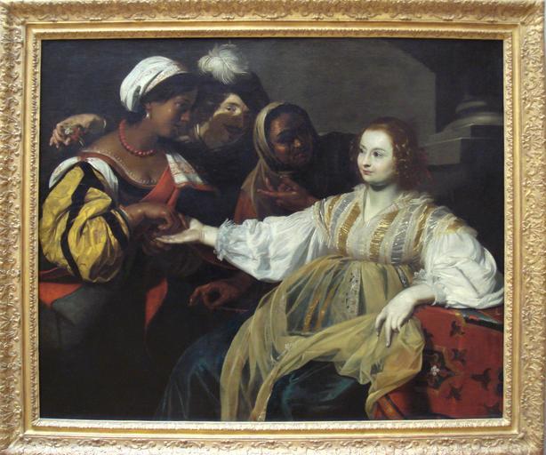 | Keywords: Nicolas Regnier La Diseuse de Bonne Aventure 1626 Le Louvre.jpg Artwork Creator Nicolas Régnier The Fortune Teller La Diseuse de Bonne Aventure ca 1626 oil canvas cm 127 150 Institution Louvre object department paintings room ID 341 object history provenanceEvent purchase 1816 Louvre number 366 louvre online 1112 000PE002327 Other versions PHGCOM French paintings in the Louvre - Room 11 Regnier Diseuse Nicolas Régnier 1626 1626 paintings Paintings of carpets Fortune-teller reading palm in art 1620s paintings from France 1620s paintings in the Louvre 17th-century oil on canvas paintings in France Resting arms in art Eye contact in art 17th-century way of life in painting Roma people in art Oriental carpets in Renaissance painting |