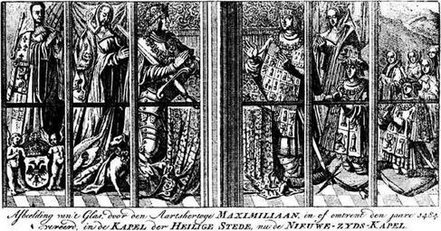 | Keywords: Nieuwezijds Kapel Amsterdam stained glass.jpg en Stained glass from the Nieuwezijds Kapel or Heilige Stede Amsterdam detail of a 18th century engraving nl Glas in loodraam uit de Nieuwezijds Kapel of Heilige Stede Amsterdam detail van een 18e-eeuwse prent From left to right / Van links naar rechts Mary of Burgundy Bianca Maria Sforza Maximilian I Holy Roman Emperor Philip of Castile Joan of Castile Charles V Holy Roman Emperor Ferdinand I Holy Roman Emperor Eleanor of Austria Isabella of Austria Mary of Austria Catherine of Austria http //libserv tudelft nl/tresor/books/Architectuur/De_Opmerker/dvd3/mm0_0002/mm0_0067 jpg Jan Fokke engraver c 1765 PD-old Nieuwezijds Kapel 1347 De Opmerker Mary of Burgundy Maximilian I Holy Roman Emperor in engravings Philip I of Castile Charles V Holy Roman Emperor in engravings Ferdinand I Holy Roman Emperor |