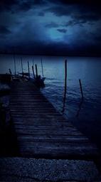 Keywords: night boardwalk water sea boot blue sky clouds atmospheric quiet wood fishing boat calm pier