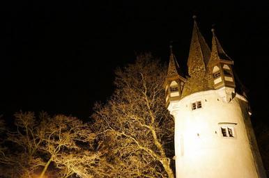 Keywords: night tree building tower yellow winter dark mystical fairytale