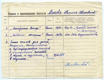 | Keywords: NikMakov-spavka-o-proizved.jpg en List of works by Nikolai Makov The Leningrad poet ru Cп авка о п оизведениях писателя акова иколая Ивановича Document Not applicable 1965 Own family archive PD-RU-exempt Nikolai Ivanovich Makov Poets from Russia Russian poets People of Saint Petersburg 1900 births 1966 deaths |