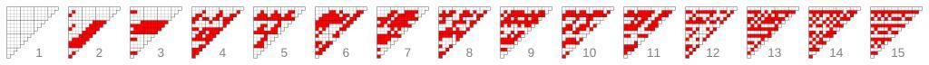 Keywords: Nimber multiplication 16; inversion sets.svg Inversion sets of the 15 Walsh permutations in the 16x16 nimber multiplication table 100px Inkscape bin2svg own 2012 Mate2code Inversion set of a 4-bit Walsh permutation Nimber multiplication