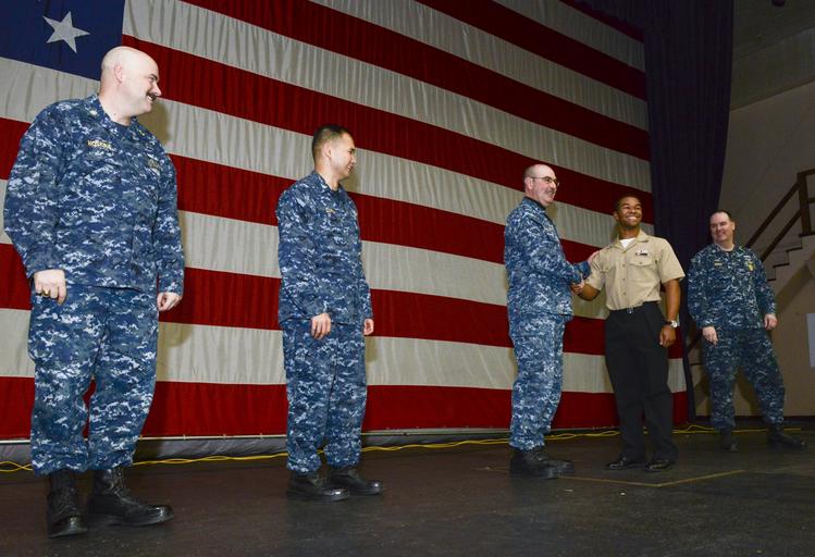 | Keywords: Nimitz CO congratulates frocked PO3 151125-N-CE703-043.jpg en NAVAL BASE KITSAP-BREMERTON Wash Nov 25 2015 Captain John Ring commanding officer of USS Nimitz CVN 68 congratulates Interior Communications Electrician 3rd Class Austin Craig during a frocking ceremony at Naval Base Kitsap-Bremerton base gym Nimitz is currently undergoing an extended planned incremental maintenance availability at Puget Sound Naval Shipyard and Intermediate Maintenance Facility where the ship is receiving scheduled maintenance and upgrades U S Navy photo by Mass Communication Specialist 2nd Class Ian Zagrocki/Released <br>Unit USS NIMITZ 2015-11-25 Petty Officer 2nd Class ian zagrocki https //www dvidshub net/image/2307198/nimitz-co-congratulates-frocked-po3 151125-N-CE703-043 2015-11-26 13 13 NAVAL BASE KITSAP-BREMERTON WA US PD-USGov-Military-Navy Naval Base Kitsap USS Nimitz CVN-68 Images from DoD uploaded by FĂŚ |