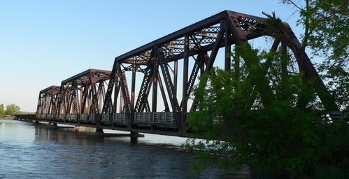| Keywords: Niobrara State Park bridge from NW 2.JPG Niobrara River Bridge near the mouth of the Niobrara in Knox County Nebraska ; seen from the northwest downstream The bridge was built in 1929 to carry the Chicago and North Western Railroad across the Niobrara immediately upstream from its confluence with the Missouri It consists of three rigid-connected Warren through truss spans at the west end then seven steel plate through girders then 29 timber stringer approach spans over the floodplain to the east It is now a part of Niobrara State Park where it serves as a footbridge The bridge is listed in the National Register of Historic Places own Ammodramus 2010-05-08 Pictures by Ammodramus Taken with Panasonic Lumix DMC-FZ20 Niobrara State Park bridge |