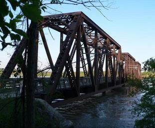 | Keywords: Niobrara State Park bridge from SW.JPG Niobrara River Bridge near the mouth of the Niobrara in Knox County Nebraska ; seen from the southwest upstream The bridge was built in 1929 to carry the Chicago and North Western Railroad across the Niobrara immediately upstream from its confluence with the Missouri It consists of three rigid-connected Warren through truss spans at the west end then seven steel plate through girders then 29 timber stringer approach spans over the floodplain to the east It is now a part of Niobrara State Park where it serves as a footbridge The bridge is listed in the National Register of Historic Places own 2010-05-08 Ammodramus Pictures by Ammodramus Taken with Panasonic Lumix DMC-FZ20 Niobrara State Park bridge |