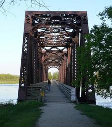 | Keywords: Niobrara State Park bridge from W.JPG 92001576 Niobrara River Bridge near the mouth of the Niobrara in Knox County Nebraska ; seen from the west The bridge was built in 1929 to carry the Chicago and North Western Railroad across the Niobrara immediately upstream from its confluence with the Missouri It consists of three rigid-connected Warren through truss spans at the west end then seven steel plate through girders then 29 timber stringer approach spans over the floodplain to the east It is now a part of Niobrara State Park where it serves as a footbridge The bridge is listed in the National Register of Historic Places In the photo left is downstream own 2010-05-08 Ammodramus Pictures by Ammodramus Taken with Panasonic Lumix DMC-FZ20 Niobrara State Park bridge |