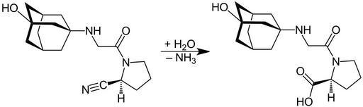 Keywords: Nitril Hydrolysis V.1.svg en Nitril_Hydrolysis de Nitril_Hydrolyse own Jü 12/03/2011 Vildagliptin metabolism Cc-zero Metabolism Chemical reactions
