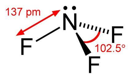 Keywords: Nitrogen-trifluoride-2D-dimensions.png Structural formula of the nitrogen trifluoride molecule NF<sub>3</sub> including the N-F bond length and the F-N-F bond angle own Benjah-bmm27 Benjah-bmm27 Images by Ben Mills Nitrogen trifluoride