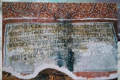 Keywords: Nivitsi Psarades Panagia Eleousa Inscription.JPG Ктито ският надпис в Света Бого одица Елеуса ивици http //tribonio blogspot com/2013/07/blog-post_2 html 1373 author PD-old-100 Psarades