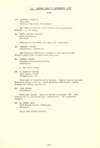 | Keywords: Nixon-opponents-3.jpg Page 3 of Nixon's Enemies List compiled by George T Bell Text U S House of Representatives Resolution 803 adopted 410-4 on 6 February 1974 18 42 8 March 2010 UTC U S House of Representatives and George T Bell http //www archive org/details/statementofinfor08unit H Res 803 via archive org PD-USGov 14 LAMBERT SAMUEL M <br> President<br> National Education Association<br> Has taken us on vis a vis federal aid to parochial schools a ™72 issue <p> <p> 15 MOTT STEWART RAWLINGS<br> Mott Associates<br> New York<br> Nothing but big money for radic-lib candidates <p> <p> 16 DELLUMS RONALD<br> Congressman California<br> Had extensive EMK-Tunney support in his election bid Success might help in California next year <p> <p> 17 SCHORR DANIEL<br> Columbia Broadcasting System<br> Washington<br> A real media enemy <p> <p> 18 S HARRISON DOGOLE<br> 2011 Walnut Street<br> Philadelphia Pa <br> President of Globe Security Systems fourth largest private detective agency in U S Heavy Humphrey contributor Could program his agency against us <p> <p> 19 PAUL NEWMAN<br> California<br> Radic-lib causes Heavy McCarthy involvement ™68 Used effectively in nationwide T V commercials ™72 involvement certain <p> <p> 20 MC GRORY MARY<br> 2710 Macomb Street Washington<br> Columnist<br> Daily hate Nixon articles <p> Original upload log en wikipedia Billinghurst CommonsHelper page en wikipedia Nixon-opponents-3 jpg 2010-03-08 18 42 Jokestress 674×988× 203842 bytes <nowiki> Page 3 of Nixon's Enemies List compiled by George T Bell U S House of Representatives Resolution 803 adopted 410-4 on 6 February 1974 ~~~~~ U S House</nowiki> Watergate scandal Walnut Street Philadelphia 2011 Nixon's Enemies List |