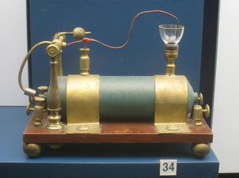 | Keywords: NMAH DC - IMG 8815.JPG Early induction coil 1838 by Charles G Page US Exhibit in National Museum of American History Washington DC USA The arm dipping into the glass cup was an early contact breaker or interrupter which repeatedly broke the current to the primary to create the flux changes needed for induction The cup was filled with mercury and the end of the wire from the battery was in it acting as a switch to complete the primary circuit When battery power was supplied current flowed through the arm to the coil primary creating a magnetic field in the coil This attracted the iron piece on the left end of the arm next to the coil This lifted the right end of the arm out of the mercury cup breaking the primary circuit The magnetic field in the coil collapsed releasing the arm which fell back into the mercury completing the circuit again and the cycle repeated Each time the arm lifted out of the mercury breaking the primary circuit the magnetic flux change induced a high voltage pulse in the secondary of the coil Funkeninduktor 1838 Charles G Page US National Museum of American History Washington DC USA Bobine de Ruhmkorff Créé par Charles G Page États-Unis en 1838 National Museum of American History Washington DC États-Unis Vroege uitvoering 1838 van een vonkinductor/Ruhmkorffinductor gemaakt door Charles G Page VS Tentoongesteld in het National Museum of American History Washington DC VS I took this photograph 2011-01-18 15 35 47 Daderot Public domain Electrical equipment in the National Museum of American History Induction coils |