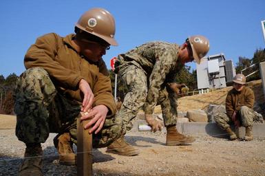 | Keywords: NMCB 1 continues humanitarian, construction operations in the Pacific 140222-N-QJ900-235.jpg en Seabees from Naval Mobile Construction Battalion 1 Detail Chinhae hold string that is tied to wood with a 4-inch marker while Engineering Aide 2nd Class Connors marks where the ground needs to be raised Feb 22 2014 NMCB 1 Detail Chinhae is tasked with preparing a side road to the Turtle Cove Dining Facility where the Republic of Korea contractors will lay asphalt Aligned with Secretary of the Navy Ray Mabus' four priorities of people platforms partnerships and power NMCB 1 will deliver the Navy's forward presence through its work with several host nations at its CCADs in the Pacific and will continue to conduct construction operations in the Northern Command U S Navy photo by Aviation Boatswain's Mate 3rd Class Leanna Manke/Released <br>Unit Naval Mobile Construction Battalion 1 2014-02-21 NMCB https //www dvidshub net/image/1177516/nmcb-1-continues-humanitarian-construction-operations-pacific 140222-N-QJ900-235 2014-03-02 01 26 CHINHAE KR PD-USGov-Military-Navy Photographs by Defense Video and Imagery Distribution System Ray Mabus in 2014 Images from DoD uploaded by Fæ |