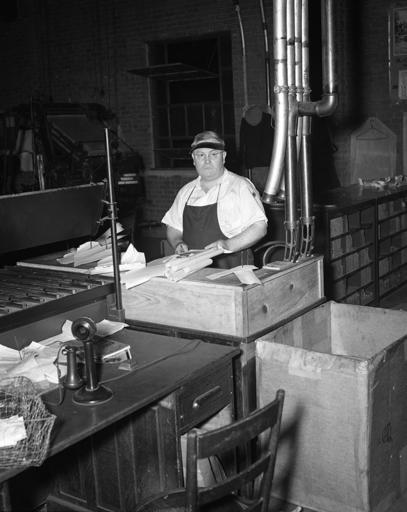 | Keywords: blackandwhite monochrome black and white From the September 3, 1938 issue of the News and Observer: "Foreman of the composing room of The News and Observer for 18 years, stocky, red headed Ellis Speer, a native of Winston-Salem, was apprenticed 37 years ago at the age of 12 and has carried his union card since he was 17 years old. Designer of the new composing room, best lighted and one of the best arranged in the United States, Speer was foreman of the Winston-Salem Journal's composing room before he was 21 years old. He also served eight years as foreman of The Greensboro News before coming to Raleigh." From the N&O negative collection, State Archives of North Carolina, Raleigh, NC. Photo copyrighted by the Raleigh News and Observer. Illegal to use without express permission from the N&O. From the September 3, 1938 issue of the News and Observer: "Foreman of the composing room of The News and Observer for 18 years, stocky, red headed Ellis Speer, a native of Winston-Salem, was apprenticed 37 years ago at the age of 12 and has carried his union card since he was 17 years old. Designer of the new composing room, best lighted and one of the best arranged in the United States, Speer was foreman of the Winston-Salem Journal's composing room before he was 21 years old. He also served eight years as foreman of The Greensboro News before coming to Raleigh." From the N&O negative collection, State Archives of North Carolina, Raleigh, NC. Photo copyrighted by the Raleigh News and Observer. Illegal to use without express permission from the N&O. |