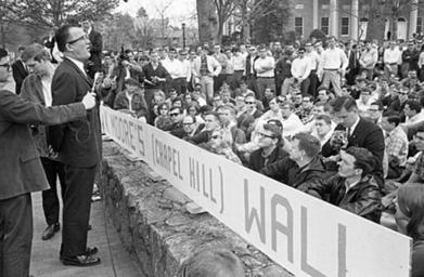 | Keywords: blackandwhite monochrome black and white On June 26, 1963, the North Carolina General Assembly passed the Act to Regulate Visiting Speakers, later known as the Speaker Ban Law. The law forbade anyone to speak on a University of North Carolina campus who was a known member of the Communist Party, was known to advocate overthrow of the United States Constitution, or had invoked the Fifth Amendment in respect of communist or "subversive" connections. The law was rushed through in the closing hours of the legislative session with virtually no debate. Governor Terry Sanford was against the Speaker Ban bill, but at that time the governor of North Carolina could not veto legislation. In the wake of the passage of this law, the communities on the UNC campuses rose up in protest. Students, faculty, and community members protested the law and what it represented over the course of the next several years. A number of complex issues involving many key North Carolina political figures and national leaders kept the controversy very active and widely debated through the mid-1960's. In 1965, the North Carolina General Assembly established a commission to look into the consequenses of the law and recommend either ammedment or repeal of the law. The commission held public hearings in August and September of 1965 and in November amended the law absolving the state legislature from having to make rulings on who could speak on campuses and who could not and returning effective control over those issues to the universities. (Speaker Ban Law Study Commission records are held by the State Archives of North Carolina; finding aid is online www.archives.ncdcr.gov/findingaids/pdf/sa_speaker_ban_law...). In 1966 students at the University of North Carolina at Chapel Hill led by Student Body President Paul Dickson invited Herbert Aptheker and Frank Wilkinson ('known' Communists) to speak on the campus. As expected, the university refused to allow either of the speakers to give their speeches on campus. Instead, they addressed the assembled crowd on March 2, 1966, from across the stone wall that separates the university from the town of Chapel Hill. Ultimately a federal law suit against the university and the State of North Carolina was filed by UNC students. On February 19, 1968, after two years of consideration by the Federal District Court in Greensboro, Dickson, et al. v Sitterson, et al. was decided for the plaintiffs -- the court's opinion found the Speaker Ban law and policy unconstitutional. For more information on the Speaker Ban Law, its complexities, and surrounding events, please see this online exhibit and collection www.lib.unc.edu/mss/exhibits/protests/ban.html, NCpedia entry ncpedia.org/speaker-ban-law, and www.northcarolinahistory.org/commentary/187/entry/, used in the drafting of the above description of this set of images. COPYRIGHTED BY THE RALEIGH NEWS AND OBSERVER NEWSPAPER. DO NOT USE OR PUBLISH WITHOUT EXPRESSED CONSENT FROM THE N&O. On June 26, 1963, the North Carolina General Assembly passed the Act to Regulate Visiting Speakers, later known as the Speaker Ban Law. The law forbade anyone to speak on a University of North Carolina campus who was a known member of the Communist Party, was known to advocate overthrow of the United States Constitution, or had invoked the Fifth Amendment in respect of communist or "subversive" connections. The law was rushed through in the closing hours of the legislative session with virtually no debate. Governor Terry Sanford was against the Speaker Ban bill, but at that time the governor of North Carolina could not veto legislation. In the wake of the passage of this law, the communities on the UNC campuses rose up in protest. Students, faculty, and community members protested the law and what it represented over the course of the next several years. A number of complex issues involving many key North Carolina political figures and national leaders kept the controversy very active and widely debated through the mid-1960's. In 1965, the North Carolina General Assembly established a commission to look into the consequenses of the law and recommend either ammedment or repeal of the law. The commission held public hearings in August and September of 1965 and in November amended the law absolving the state legislature from having to make rulings on who could speak on campuses and who could not and returning effective control over those issues to the universities. (Speaker Ban Law Study Commission records are held by the State Archives of North Carolina; finding aid is online www.archives.ncdcr.gov/findingaids/pdf/sa_speaker_ban_law...). In 1966 students at the University of North Carolina at Chapel Hill led by Student Body President Paul Dickson invited Herbert Aptheker and Frank Wilkinson ('known' Communists) to speak on the campus. As expected, the university refused to allow either of the speakers to give their speeches on campus. Instead, they addressed the assembled crowd on March 2, 1966, from across the stone wall that separates the university from the town of Chapel Hill. Ultimately a federal law suit against the university and the State of North Carolina was filed by UNC students. On February 19, 1968, after two years of consideration by the Federal District Court in Greensboro, Dickson, et al. v Sitterson, et al. was decided for the plaintiffs -- the court's opinion found the Speaker Ban law and policy unconstitutional. For more information on the Speaker Ban Law, its complexities, and surrounding events, please see this online exhibit and collection www.lib.unc.edu/mss/exhibits/protests/ban.html, NCpedia entry ncpedia.org/speaker-ban-law, and www.northcarolinahistory.org/commentary/187/entry/, used in the drafting of the above description of this set of images. COPYRIGHTED BY THE RALEIGH NEWS AND OBSERVER NEWSPAPER. DO NOT USE OR PUBLISH WITHOUT EXPRESSED CONSENT FROM THE N&O. |
