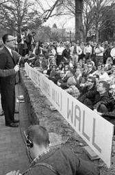 Keywords: blackandwhite monochrome outdoor black and white On June 26, 1963, the North Carolina General Assembly passed the Act to Regulate Visiting Speakers, later known as the Speaker Ban Law. The law forbade anyone to speak on a University of North Carolina campus who was a known member of the Communist Party, was known to advocate overthrow of the United States Constitution, or had invoked the Fifth Amendment in respect of communist or "subversive" connections. The law was rushed through in the closing hours of the legislative session with virtually no debate. Governor Terry Sanford was against the Speaker Ban bill, but at that time the governor of North Carolina could not veto legislation. In the wake of the passage of this law, the communities on the UNC campuses rose up in protest. Students, faculty, and community members protested the law and what it represented over the course of the next several years. A number of complex issues involving many key North Carolina political figures and national leaders kept the controversy very active and widely debated through the mid-1960's. In 1965, the North Carolina General Assembly established a commission to look into the consequenses of the law and recommend either ammedment or repeal of the law. The commission held public hearings in August and September of 1965 and in November amended the law absolving the state legislature from having to make rulings on who could speak on campuses and who could not and returning effective control over those issues to the universities. (Speaker Ban Law Study Commission records are held by the State Archives of North Carolina; finding aid is online www.archives.ncdcr.gov/findingaids/pdf/sa_speaker_ban_law...). In 1966 students at the University of North Carolina at Chapel Hill led by Student Body President Paul Dickson invited Herbert Aptheker and Frank Wilkinson ('known' Communists) to speak on the campus. As expected, the university refused to allow either of the speakers to give their speeches on campus. Instead, they addressed the assembled crowd on March 2, 1966, from across the stone wall that separates the university from the town of Chapel Hill. Ultimately a federal law suit against the university and the State of North Carolina was filed by UNC students. On February 19, 1968, after two years of consideration by the Federal District Court in Greensboro, Dickson, et al. v Sitterson, et al. was decided for the plaintiffs -- the court's opinion found the Speaker Ban law and policy unconstitutional. For more information on the Speaker Ban Law, its complexities, and surrounding events, please see this online exhibit and collection www.lib.unc.edu/mss/exhibits/protests/ban.html, NCpedia entry ncpedia.org/speaker-ban-law, and www.northcarolinahistory.org/commentary/187/entry/, used in the drafting of the above description of this set of images. COPYRIGHTED BY THE RALEIGH NEWS AND OBSERVER NEWSPAPER. DO NOT USE OR PUBLISH WITHOUT EXPRESSED CONSENT FROM THE N&O. On June 26, 1963, the North Carolina General Assembly passed the Act to Regulate Visiting Speakers, later known as the Speaker Ban Law. The law forbade anyone to speak on a University of North Carolina campus who was a known member of the Communist Party, was known to advocate overthrow of the United States Constitution, or had invoked the Fifth Amendment in respect of communist or "subversive" connections. The law was rushed through in the closing hours of the legislative session with virtually no debate. Governor Terry Sanford was against the Speaker Ban bill, but at that time the governor of North Carolina could not veto legislation. In the wake of the passage of this law, the communities on the UNC campuses rose up in protest. Students, faculty, and community members protested the law and what it represented over the course of the next several years. A number of complex issues involving many key North Carolina political figures and national leaders kept the controversy very active and widely debated through the mid-1960's. In 1965, the North Carolina General Assembly established a commission to look into the consequenses of the law and recommend either ammedment or repeal of the law. The commission held public hearings in August and September of 1965 and in November amended the law absolving the state legislature from having to make rulings on who could speak on campuses and who could not and returning effective control over those issues to the universities. (Speaker Ban Law Study Commission records are held by the State Archives of North Carolina; finding aid is online www.archives.ncdcr.gov/findingaids/pdf/sa_speaker_ban_law...). In 1966 students at the University of North Carolina at Chapel Hill led by Student Body President Paul Dickson invited Herbert Aptheker and Frank Wilkinson ('known' Communists) to speak on the campus. As expected, the university refused to allow either of the speakers to give their speeches on campus. Instead, they addressed the assembled crowd on March 2, 1966, from across the stone wall that separates the university from the town of Chapel Hill. Ultimately a federal law suit against the university and the State of North Carolina was filed by UNC students. On February 19, 1968, after two years of consideration by the Federal District Court in Greensboro, Dickson, et al. v Sitterson, et al. was decided for the plaintiffs -- the court's opinion found the Speaker Ban law and policy unconstitutional. For more information on the Speaker Ban Law, its complexities, and surrounding events, please see this online exhibit and collection www.lib.unc.edu/mss/exhibits/protests/ban.html, NCpedia entry ncpedia.org/speaker-ban-law, and www.northcarolinahistory.org/commentary/187/entry/, used in the drafting of the above description of this set of images. COPYRIGHTED BY THE RALEIGH NEWS AND OBSERVER NEWSPAPER. DO NOT USE OR PUBLISH WITHOUT EXPRESSED CONSENT FROM THE N&O.