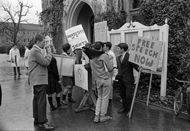 Keywords: blackandwhite monochrome black and white On June 26, 1963, the North Carolina General Assembly passed the Act to Regulate Visiting Speakers, later known as the Speaker Ban Law. The law forbade anyone to speak on a University of North Carolina campus who was a known member of the Communist Party, was known to advocate overthrow of the United States Constitution, or had invoked the Fifth Amendment in respect of communist or "subversive" connections. The law was rushed through in the closing hours of the legislative session with virtually no debate. Governor Terry Sanford was against the Speaker Ban bill, but at that time the governor of North Carolina could not veto legislation. In the wake of the passage of this law, the communities on the UNC campuses rose up in protest. Students, faculty, and community members protested the law and what it represented over the course of the next several years. A number of complex issues involving many key North Carolina political figures and national leaders kept the controversy very active and widely debated through the mid-1960's. In 1965, the North Carolina General Assembly established a commission to look into the consequenses of the law and recommend either ammedment or repeal of the law. The commission held public hearings in August and September of 1965 and in November amended the law absolving the state legislature from having to make rulings on who could speak on campuses and who could not and returning effective control over those issues to the universities. (Speaker Ban Law Study Commission records are held by the State Archives of North Carolina; finding aid is online www.archives.ncdcr.gov/findingaids/pdf/sa_speaker_ban_law...). In 1966 students at the University of North Carolina at Chapel Hill led by Student Body President Paul Dickson invited Herbert Aptheker and Frank Wilkinson ('known' Communists) to speak on the campus. As expected, the university refused to allow either of the speakers to give their speeches on campus. Instead, they addressed the assembled crowd on March 2, 1966, from across the stone wall that separates the university from the town of Chapel Hill. Ultimately a federal law suit against the university and the State of North Carolina was filed by UNC students. On February 19, 1968, after two years of consideration by the Federal District Court in Greensboro, Dickson, et al. v Sitterson, et al. was decided for the plaintiffs -- the court's opinion found the Speaker Ban law and policy unconstitutional. For more information on the Speaker Ban Law, its complexities, and surrounding events, please see this online exhibit and collection www.lib.unc.edu/mss/exhibits/protests/ban.html, NCpedia entry ncpedia.org/speaker-ban-law, and www.northcarolinahistory.org/commentary/187/entry/, used in the drafting of the above description of this set of images. COPYRIGHTED BY THE RALEIGH NEWS AND OBSERVER NEWSPAPER. DO NOT USE OR PUBLISH WITHOUT EXPRESSED CONSENT FROM THE N&O. On June 26, 1963, the North Carolina General Assembly passed the Act to Regulate Visiting Speakers, later known as the Speaker Ban Law. The law forbade anyone to speak on a University of North Carolina campus who was a known member of the Communist Party, was known to advocate overthrow of the United States Constitution, or had invoked the Fifth Amendment in respect of communist or "subversive" connections. The law was rushed through in the closing hours of the legislative session with virtually no debate. Governor Terry Sanford was against the Speaker Ban bill, but at that time the governor of North Carolina could not veto legislation. In the wake of the passage of this law, the communities on the UNC campuses rose up in protest. Students, faculty, and community members protested the law and what it represented over the course of the next several years. A number of complex issues involving many key North Carolina political figures and national leaders kept the controversy very active and widely debated through the mid-1960's. In 1965, the North Carolina General Assembly established a commission to look into the consequenses of the law and recommend either ammedment or repeal of the law. The commission held public hearings in August and September of 1965 and in November amended the law absolving the state legislature from having to make rulings on who could speak on campuses and who could not and returning effective control over those issues to the universities. (Speaker Ban Law Study Commission records are held by the State Archives of North Carolina; finding aid is online www.archives.ncdcr.gov/findingaids/pdf/sa_speaker_ban_law...). In 1966 students at the University of North Carolina at Chapel Hill led by Student Body President Paul Dickson invited Herbert Aptheker and Frank Wilkinson ('known' Communists) to speak on the campus. As expected, the university refused to allow either of the speakers to give their speeches on campus. Instead, they addressed the assembled crowd on March 2, 1966, from across the stone wall that separates the university from the town of Chapel Hill. Ultimately a federal law suit against the university and the State of North Carolina was filed by UNC students. On February 19, 1968, after two years of consideration by the Federal District Court in Greensboro, Dickson, et al. v Sitterson, et al. was decided for the plaintiffs -- the court's opinion found the Speaker Ban law and policy unconstitutional. For more information on the Speaker Ban Law, its complexities, and surrounding events, please see this online exhibit and collection www.lib.unc.edu/mss/exhibits/protests/ban.html, NCpedia entry ncpedia.org/speaker-ban-law, and www.northcarolinahistory.org/commentary/187/entry/, used in the drafting of the above description of this set of images. COPYRIGHTED BY THE RALEIGH NEWS AND OBSERVER NEWSPAPER. DO NOT USE OR PUBLISH WITHOUT EXPRESSED CONSENT FROM THE N&O.