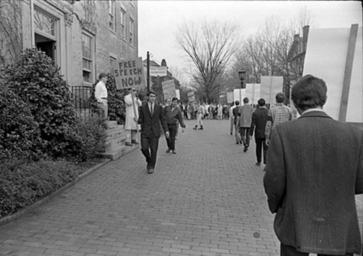 | Keywords: blackandwhite monochrome road outdoor sidewalk black and white On June 26, 1963, the North Carolina General Assembly passed the Act to Regulate Visiting Speakers, later known as the Speaker Ban Law. The law forbade anyone to speak on a University of North Carolina campus who was a known member of the Communist Party, was known to advocate overthrow of the United States Constitution, or had invoked the Fifth Amendment in respect of communist or "subversive" connections. The law was rushed through in the closing hours of the legislative session with virtually no debate. Governor Terry Sanford was against the Speaker Ban bill, but at that time the governor of North Carolina could not veto legislation. In the wake of the passage of this law, the communities on the UNC campuses rose up in protest. Students, faculty, and community members protested the law and what it represented over the course of the next several years. A number of complex issues involving many key North Carolina political figures and national leaders kept the controversy very active and widely debated through the mid-1960's. In 1965, the North Carolina General Assembly established a commission to look into the consequenses of the law and recommend either ammedment or repeal of the law. The commission held public hearings in August and September of 1965 and in November amended the law absolving the state legislature from having to make rulings on who could speak on campuses and who could not and returning effective control over those issues to the universities. (Speaker Ban Law Study Commission records are held by the State Archives of North Carolina; finding aid is online www.archives.ncdcr.gov/findingaids/pdf/sa_speaker_ban_law...). In 1966 students at the University of North Carolina at Chapel Hill led by Student Body President Paul Dickson invited Herbert Aptheker and Frank Wilkinson ('known' Communists) to speak on the campus. As expected, the university refused to allow either of the speakers to give their speeches on campus. Instead, they addressed the assembled crowd on March 2, 1966, from across the stone wall that separates the university from the town of Chapel Hill. Ultimately a federal law suit against the university and the State of North Carolina was filed by UNC students. On February 19, 1968, after two years of consideration by the Federal District Court in Greensboro, Dickson, et al. v Sitterson, et al. was decided for the plaintiffs -- the court's opinion found the Speaker Ban law and policy unconstitutional. For more information on the Speaker Ban Law, its complexities, and surrounding events, please see this online exhibit and collection www.lib.unc.edu/mss/exhibits/protests/ban.html, NCpedia entry ncpedia.org/speaker-ban-law, and www.northcarolinahistory.org/commentary/187/entry/, used in the drafting of the above description of this set of images. COPYRIGHTED BY THE RALEIGH NEWS AND OBSERVER NEWSPAPER. DO NOT USE OR PUBLISH WITHOUT EXPRESSED CONSENT FROM THE N&O. On June 26, 1963, the North Carolina General Assembly passed the Act to Regulate Visiting Speakers, later known as the Speaker Ban Law. The law forbade anyone to speak on a University of North Carolina campus who was a known member of the Communist Party, was known to advocate overthrow of the United States Constitution, or had invoked the Fifth Amendment in respect of communist or "subversive" connections. The law was rushed through in the closing hours of the legislative session with virtually no debate. Governor Terry Sanford was against the Speaker Ban bill, but at that time the governor of North Carolina could not veto legislation. In the wake of the passage of this law, the communities on the UNC campuses rose up in protest. Students, faculty, and community members protested the law and what it represented over the course of the next several years. A number of complex issues involving many key North Carolina political figures and national leaders kept the controversy very active and widely debated through the mid-1960's. In 1965, the North Carolina General Assembly established a commission to look into the consequenses of the law and recommend either ammedment or repeal of the law. The commission held public hearings in August and September of 1965 and in November amended the law absolving the state legislature from having to make rulings on who could speak on campuses and who could not and returning effective control over those issues to the universities. (Speaker Ban Law Study Commission records are held by the State Archives of North Carolina; finding aid is online www.archives.ncdcr.gov/findingaids/pdf/sa_speaker_ban_law...). In 1966 students at the University of North Carolina at Chapel Hill led by Student Body President Paul Dickson invited Herbert Aptheker and Frank Wilkinson ('known' Communists) to speak on the campus. As expected, the university refused to allow either of the speakers to give their speeches on campus. Instead, they addressed the assembled crowd on March 2, 1966, from across the stone wall that separates the university from the town of Chapel Hill. Ultimately a federal law suit against the university and the State of North Carolina was filed by UNC students. On February 19, 1968, after two years of consideration by the Federal District Court in Greensboro, Dickson, et al. v Sitterson, et al. was decided for the plaintiffs -- the court's opinion found the Speaker Ban law and policy unconstitutional. For more information on the Speaker Ban Law, its complexities, and surrounding events, please see this online exhibit and collection www.lib.unc.edu/mss/exhibits/protests/ban.html, NCpedia entry ncpedia.org/speaker-ban-law, and www.northcarolinahistory.org/commentary/187/entry/, used in the drafting of the above description of this set of images. COPYRIGHTED BY THE RALEIGH NEWS AND OBSERVER NEWSPAPER. DO NOT USE OR PUBLISH WITHOUT EXPRESSED CONSENT FROM THE N&O. |