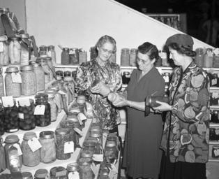 | Keywords: blackandwhite monochrome black and white At the State Fair three judges examine canned foods. Miss Addie Houston, left, Guilford Home Demonstration Agent, and Mrs. Annie Lee Harris of Rockingham (center). Miss Ruth Current, State Home Demonstration Agent, right, holds a jar of tomatoes put up by Mrs. Simon W. Dixon, Mebane, which has just taken a blue ribbon. October 1940 From the N&O negative collection, State Archives of North Carolina, Raleigh, NC. Photo copyrighted by the Raleigh News and Observer. Illegal to use without express permission from the N&O. At the State Fair three judges examine canned foods. Miss Addie Houston, left, Guilford Home Demonstration Agent, and Mrs. Annie Lee Harris of Rockingham (center). Miss Ruth Current, State Home Demonstration Agent, right, holds a jar of tomatoes put up by Mrs. Simon W. Dixon, Mebane, which has just taken a blue ribbon. October 1940 From the N&O negative collection, State Archives of North Carolina, Raleigh, NC. Photo copyrighted by the Raleigh News and Observer. Illegal to use without express permission from the N&O. |