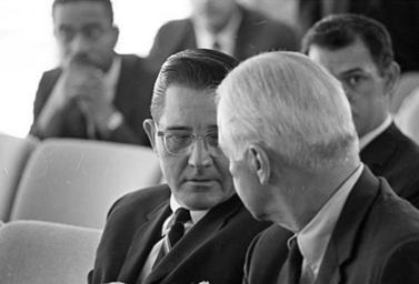 | Keywords: blackandwhite monochrome black and white Bill Friday and unidentified man. Inside the North Carolina State Legislative Building, August 1965. On June 26, 1963, the North Carolina General Assembly passed the Act to Regulate Visiting Speakers, later known as the Speaker Ban Law. The law forbade anyone to speak on a University of North Carolina campus who was a known member of the Communist Party, was known to advocate overthrow of the United States Constitution, or had invoked the Fifth Amendment in respect of communist or "subversive" connections. The law was rushed through in the closing hours of the legislative session with virtually no debate. Governor Terry Sanford was against the Speaker Ban bill, but at that time the governor of North Carolina could not veto legislation. In the wake of the passage of this law, the communities on the UNC campuses rose up in protest. Students, faculty, and community members protested the law and what it represented over the course of the next several years. A number of complex issues involving many key North Carolina political figures and national leaders kept the controversy very active and widely debated through the mid-1960's. In 1965, the North Carolina General Assembly established a commission to look into the consequenses of the law and recommend either ammedment or repeal of the law. The commission held public hearings in August and September of 1965 and in November amended the law absolving the state legislature from having to make rulings on who could speak on campuses and who could not and returning effective control over those issues to the universities. (Speaker Ban Law Study Commission records are held by the State Archives of North Carolina; finding aid is online www.archives.ncdcr.gov/findingaids/pdf/sa_speaker_ban_law...). In 1966 students at the University of North Carolina at Chapel Hill led by Student Body President Paul Dickson invited Herbert Aptheker and Frank Wilkinson ('known' Communists) to speak on the campus. As expected, the university refused to allow either of the speakers to give their speeches on campus. Instead, they addressed the assembled crowd on March 2, 1966, from across the stone wall that separates the university from the town of Chapel Hill. Ultimately a federal law suit against the university and the State of North Carolina was filed by UNC students. On February 19, 1968, after two years of consideration by the Federal District Court in Greensboro, Dickson, et al. v Sitterson, et al. was decided for the plaintiffs -- the court's opinion found the Speaker Ban law and policy unconstitutional. For more information on the Speaker Ban Law, its complexities, and surrounding events, please see this online exhibit and collection www.lib.unc.edu/mss/exhibits/protests/ban.html, NCpedia entry ncpedia.org/speaker-ban-law, and www.northcarolinahistory.org/commentary/187/entry/, used in the drafting of the above description of this set of images. COPYRIGHTED BY THE RALEIGH NEWS AND OBSERVER NEWSPAPER. DO NOT USE OR PUBLISH WITHOUT EXPRESSED CONSENT FROM THE N&O. Bill Friday and unidentified man. Inside the North Carolina State Legislative Building, August 1965. On June 26, 1963, the North Carolina General Assembly passed the Act to Regulate Visiting Speakers, later known as the Speaker Ban Law. The law forbade anyone to speak on a University of North Carolina campus who was a known member of the Communist Party, was known to advocate overthrow of the United States Constitution, or had invoked the Fifth Amendment in respect of communist or "subversive" connections. The law was rushed through in the closing hours of the legislative session with virtually no debate. Governor Terry Sanford was against the Speaker Ban bill, but at that time the governor of North Carolina could not veto legislation. In the wake of the passage of this law, the communities on the UNC campuses rose up in protest. Students, faculty, and community members protested the law and what it represented over the course of the next several years. A number of complex issues involving many key North Carolina political figures and national leaders kept the controversy very active and widely debated through the mid-1960's. In 1965, the North Carolina General Assembly established a commission to look into the consequenses of the law and recommend either ammedment or repeal of the law. The commission held public hearings in August and September of 1965 and in November amended the law absolving the state legislature from having to make rulings on who could speak on campuses and who could not and returning effective control over those issues to the universities. (Speaker Ban Law Study Commission records are held by the State Archives of North Carolina; finding aid is online www.archives.ncdcr.gov/findingaids/pdf/sa_speaker_ban_law...). In 1966 students at the University of North Carolina at Chapel Hill led by Student Body President Paul Dickson invited Herbert Aptheker and Frank Wilkinson ('known' Communists) to speak on the campus. As expected, the university refused to allow either of the speakers to give their speeches on campus. Instead, they addressed the assembled crowd on March 2, 1966, from across the stone wall that separates the university from the town of Chapel Hill. Ultimately a federal law suit against the university and the State of North Carolina was filed by UNC students. On February 19, 1968, after two years of consideration by the Federal District Court in Greensboro, Dickson, et al. v Sitterson, et al. was decided for the plaintiffs -- the court's opinion found the Speaker Ban law and policy unconstitutional. For more information on the Speaker Ban Law, its complexities, and surrounding events, please see this online exhibit and collection www.lib.unc.edu/mss/exhibits/protests/ban.html, NCpedia entry ncpedia.org/speaker-ban-law, and www.northcarolinahistory.org/commentary/187/entry/, used in the drafting of the above description of thi