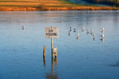 Keywords: no fishing lake no fishing water nature landscape blue summer outdoors grass calm tranquil relaxation scene fish sign birds ducks animal symbol