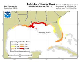 | Keywords: Noaa-projection-deepwater.png en Probability of Shoreline Threat as of Day 120 for a 33 000 barrels/day release for 90 days by NOAA on Deepwater Horizon oil spill Published 2010-07-02 http //response restoration noaa gov/dwh php entry_id 815 NOAA 2010-07-02 National Oceanic and Atmospheric Administration Maps of the Deepwater Horizon oil spill PD-USGov |