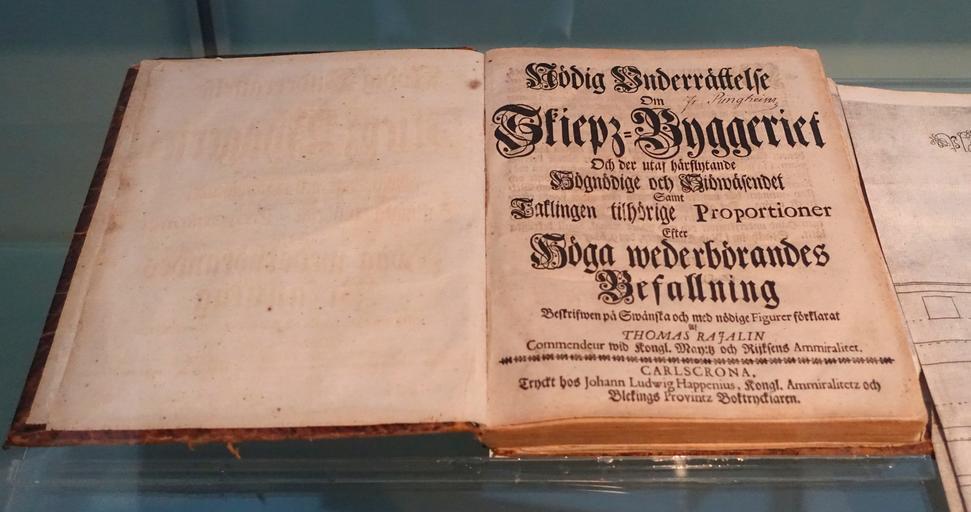 | Keywords: Nödig underrättelse om skeppsbyggeriet by Thomas von Rajalin, 1730 - Marinmuseum, Karlskrona, Sweden - DSC08833.JPG en Exhibit in the Marinmuseum Karlskrona Sweden This exhibit is old enough so that it is in the public domain Photography was permitted in the museum without restriction 2014-09-11 06 37 31 own Daderot other versions cc-zero Uploaded with UploadWizard Books in Marinmuseum Thomas von Rajalin | ||||