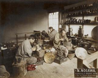 | Keywords: Nogawa Bronzeware, Kyoto by Otabichio c1885.jpg Hand-colored Japanese albumen print ca 1885 titled in the negative N NOGAWA Manufacturer of BRONZE WARE / No 22 Shijo Otabichio / Kioto Japan showing four craftsmen at work in the workshop of Noboru Nogawa èƒ½å· ç™» in Kyoto http //historical ha com/itm/photography/hand-tinted-albumen-nogawa-factory-in-japan/a/6006-47286 s Heritage Auctions ~ 1885 unattributed PD-old https //rekishinihon com/2013/03/24/kyoto-bronze-ware-craftsmen/ http //db nichibun ac jp/en/d/KSA/info/YA069/ p 4 http //joseflebovicgallery com/Catalogue/CL_173_2014/Pages/pg08 html http //cwfp biz/cgi-bin/sg_past/tm pl itm ib185 22 11_Occupations https //archive org/stream/ahandbookfortra00masogoog page/n657/mode/2up https //archive org/stream/handbookfortrave01john page/n397/mode/2up History of Kyoto Manufacturing Bronzeworkers |