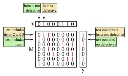 | Keywords: Nonadaptive Group Testing.svg en A typical group testing setup A non-adaptive algorithm first chooses the matrix M and is then given the vector y The problem is then to find an estimate for x 2016-10-19 own CheCheDaWaff other versions cc-zero Matrix Statistics Combinatorics |