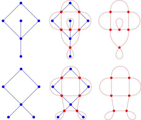 Keywords: Nonisomorphic medial graph example.svg en Two embeddings of the same graph in blue can have nonisomorphic medial graphs in red <source lang latex > \documentclass article \thispagestyle empty \usepackagemargin 0in geometry \usepackage tikz \def\nodeDist 2 5cm \tikzstyle origVertex draw blue fill shape circle \tikzstyle newVertex draw red fill shape circle \tikzstyle invisibleVertex shape circle \tikzstyle origEdge blue \tikzstyle newEdge red densely dashed \tikzstyle invisibleEdge draw opacity 0 \begin document \begin tikzpicture node distance \nodeDist semithick \nodeorigVertex 0 ; \nodeorigVertex 1 below of 0 ; \nodeorigVertex 2 left of 1 ; \nodeorigVertex 3 right of 1 ; \nodeorigVertex 4 below of 1 ; \nodeorigVertex 5 below of 4 ; \path 0 edgeorigEdge nodeinvisibleVertex m0 2 edgeorigEdge nodeinvisibleVertex m1 3 1 edgeorigEdge nodeinvisibleVertex m2 4 2 edgeorigEdge nodeinvisibleVertex m3 4 3 edgeorigEdge nodeinvisibleVertex m4 4 4 edgeorigEdge nodeinvisibleVertex m5 5 ; \path m0 edgeinvisibleEdge out 90 in 90 looseness 2 m1 edgeinvisibleEdge m1 edgeinvisibleEdge out 180 in 180 looseness 2 m3 edgeinvisibleEdge m3 m1 edgeinvisibleEdge out 0 in 0 looseness 2 m4 edgeinvisibleEdge m4 m2 edgeinvisibleEdge out 125 in 55 looseness 30 m2 edgeinvisibleEdge m3 edgeinvisibleEdge m4 m3 edgeinvisibleEdge bend right m5 m4 edgeinvisibleEdge bend left m5 m5 edgeinvisibleEdge out -125 in -55 looseness 30 m5 ; \end tikzpicture \begin tikzpicture node distance \nodeDist semithick \nodeorigVertex 0 ; \nodeorigVertex 1 below of 0 ; \nodeorigVertex 2 left of 1 ; \nodeorigVertex 3 right of 1 ; \nodeorigVertex 4 below of 1 ; \nodeorigVertex 5 below of 4 ; \path 0 edgeorigEdge nodenewVertex m0 2 edgeorigEdge nodenewVertex m1 3 1 edgeorigEdge nodenewVertex m2 4 2 edgeorigEdge nodenewVertex m3 4 3 edgeorigEdge nodenewVertex m4 4 4 edgeorigEdge nodenewVertex m5 5 ; \path m0 edgenewEdge out 90 in 90 looseness 2 m1 edgenewEdge m1 edgenewEdge out 180 in 180 looseness 2 m3 edgenewEdge m3 m1 edgenewEdge out 0 in 0 looseness 2 m4 edgenewEdge m4 m2 edgenewEdge out 125 in 55 looseness 30 m2 edgenewEdge m3 edgenewEdge m4 m3 edgenewEdge bend right m5 m4 edgenewEdge bend left m5 m5 edgenewEdge out -125 in -55 looseness 30 m5 ; \end tikzpicture \begin tikzpicture node distance \nodeDist semithick \nodeinvisibleVertex 0 ; \nodeinvisibleVertex 1 below of 0 ; \nodeinvisibleVertex 2 left of 1 ; \nodeinvisibleVertex 3 right of 1 ; \nodeinvisibleVertex 4 below of 1 ; \nodeinvisibleVertex 5 below of 4 ; \path 0 edgeinvisibleEdge nodenewVertex m0 2 edgeinvisibleEdge nodenewVertex m1 3 1 edgeinvisibleEdge nodenewVertex m2 4 2 edgeinvisibleEdge nodenewVertex m3 4 3 edgeinvisibleEdge nodenewVertex m4 4 4 edgeinvisibleEdge nodenewVertex m5 5 ; \path m0 edgenewEdge out 90 in 90 looseness 2 m1 edgenewEdge m1 edgenewEdge out 180 in 180 looseness 2 m3 edgenewEdge m3 m1 edgenewEdge out 0 in 0 looseness 2 m4 edgenewEdge m4 m2 edgenewEdge out 125 in 55 looseness 30 m2 edgenewEdge m3 edgenewEdge m4 m3 edgenewEdge bend right m5 m4 edgenewEdge bend left m5 m5 edgenewEdge out -125 in -55 looseness 30 m5 ; \end tikzpicture \begin tikzpicture node distance \nodeDist semithick \nodeorigVertex 0 ; \nodeinvisibleVertex 1 below of 0 ; \nodeorigVertex 2 left of 1 ; \nodeorigVertex 3 right of 1 ; \nodeorigVertex 4 below of 1 ; \nodeorigVertex 5 below left of 4 ; \nodeorigVertex 6 below right of 4 ; \path 0 edgeorigEdge nodeinvisibleVertex m0 2 edgeorigEdge nodeinvisibleVertex m1 3 2 edgeorigEdge nodeinvisibleVertex m2 4 3 edgeorigEdge nodeinvisibleVertex m3 4 4 edgeorigEdge nodeinvisibleVertex m4 5 edgeorigEdge nodeinvisibleVertex m5 6 ; \path m0 edgeinvisibleEdge out 90 in 90 looseness 2 m1 edgeinvisibleEdge m1 edgeinvisibleEdge out 180 in 180 looseness 2 m2 edgeinvisibleEdge m2 m1 edgeinvisibleEdge out 0 in 0 looseness 2 m3 edgeinvisibleEdge m3 m2 edgeinvisibleEdge m3 edgeinvisibleEdge m4 m3 edgeinvisibleEdge m5 m4 edgeinvisibleEdge out -170 in -100 looseness 30 m4 edgeinvisibleEdge m5 m5 edgeinvisibleEdge out -80 in -10 looseness 30 m5 ; \end tikzpicture \begin tikzpicture node distance \nodeDist semithick \nodeorigVertex 0 ; \nodeinvisibleVertex 1 below of 0 ; \nodeorigVertex 2 left of 1 ; \nodeorigVertex 3 right of 1 ; \nodeorigVertex 4 below of 1 ; \nodeorigVertex 5 below left of 4 ; \nodeorigVertex 6 below right of 4 ; \path 0 edgeorigEdge nodenewVertex m0 2 edgeorigEdge nodenewVertex m1 3 2 edgeorigEdge nodenewVertex m2 4 3 edgeorigEdge nodenewVertex m3 4 4 edgeorigEdge nodenewVertex m4 5 edgeorigEdge nodenewVertex m5 6 ; \path m0 edgenewEdge out 90 in 90 looseness 2 m1 edgenewEdge m1 edgenewEdge out 180 in 180 looseness 2 m2 edgenewEdge m2 m1 edgenewEdge out 0 in 0 looseness 2 m3 edgenewEdge m3 m2 edgenewEdge m3 edgenewEdge m4 m3 edgenewEdge m5 m4 edgenewEdge out -170 in -100 looseness 30 m4 edgenewEdge m5 m5 edgenewEdge out -80 in -10 looseness 30 m5 ; \end tikzpicture \begin tikzpicture node distance \nodeDist semithick \nodeinvisibleVertex 0 ; \nodeinvisibleVertex 1 below of 0 ; \nodeinvisibleVertex 2 left of 1 ; \nodeinvisibleVertex 3 right of 1 ; \nodeinvisibleVertex 4 below of 1 ; \nodeinvisibleVertex 5 below left of 4 ; \nodeinvisibleVertex 6 below right of 4 ; \path 0 edgeinvisibleEdge nodenewVertex m0 2 edgeinvisibleEdge nodenewVertex m1 3 2 edgeinvisibleEdge nodenewVertex m2 4 3 edgeinvisibleEdge nodenewVertex m3 4 4 edgeinvisibleEdge nodenewVertex m4 5 edgeinvisibleEdge nodenewVertex m5 6 ; \path m0 edgenewEdge out 90 in 90 looseness 2 m1 edgenewEdge m1 edgenewEdge out 180 in 180 looseness 2 m2 edgenewEdge m2 m1 edgenewEdge out 0 in 0 looseness 2 m3 edgenewEdge m3 m2 edgenewEdge m3 edgenewEdge m4 m3 edgenewEdge m5 m4 edgenewEdge out -170 in -100 looseness 30 m4 edgenewEdge m5 m5 edgenewEdge out -80 in -10 looseness 30 m5 ; \end tikzpicture \end document </source> Self 2012-12-09 Undirected planar graphs Images with LaTeX source code Cc-zero |