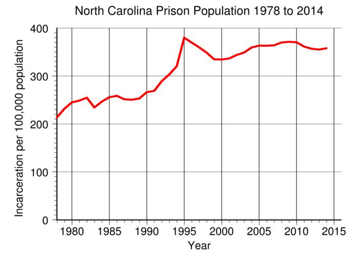 Keywords: North Carolina Prison Population.svg en North Carolina prison incarceration rate per 100 000 population from 1978 to 2014 Data from http //www bjs gov/index cfm ty nps BJS 2016-05-11 own Delphi234 other versions current annually Generated with Wikimedia SVG Chart SVG Chart/box cc-zero Prisons in North Carolina Imprisonment and detention rates in the United States |