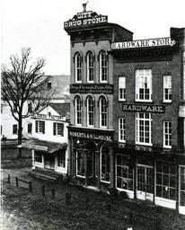 | Keywords: outdoor blackandwhite architecture building black and white Northeast corner of West Main Street at Rose, Kalamazoo, c1860 [picture] General Note: Description: Good of melodeon factory (Blakeman & Gibbs, Greek Revival), Roberts & Hillhouse City Drug Store (Italianate) and the three story brick hardware store. The white frame building at the far left behind the tree is the Tremont House hotel. This is identical to, and possibly a copy of, the Kalamazoo Valley Museum photograph 52.197. General Note: Verification: Taken after the 1853 fire and before curbs and Nicholson pavement were laid in 1866. General Note: Holdings: 1 - 10" X 8" copy print. From the Kalamazoo Public Library collection. kpl.gov Northeast corner of West Main Street at Rose, Kalamazoo, c1860 [picture] General Note: Description: Good of melodeon factory (Blakeman & Gibbs, Greek Revival), Roberts & Hillhouse City Drug Store (Italianate) and the three story brick hardware store. The white frame building at the far left behind the tree is the Tremont House hotel. This is identical to, and possibly a copy of, the Kalamazoo Valley Museum photograph 52.197. General Note: Verification: Taken after the 1853 fire and before curbs and Nicholson pavement were laid in 1866. General Note: Holdings: 1 - 10" X 8" copy print. From the Kalamazoo Public Library collection. kpl.gov |