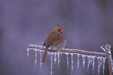 Keywords: northern cardinal bird redbird frozen branch ice winter wildlife red songbird perched cardinal