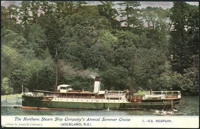 | Keywords: outdoor Shows the S S Ngapuhi berthed at a low pier, with bush in the background. The National Maritime Museum website says: "The Summer Cruise began Friday night and went through to the next Saturday and cost 7 pounds. The first summer cruise was held in 1904 and they continued until 1908. They were truly the high point of the summer, combining picturesque scenery with activities, excellent food and entertainment. On-board facilities included a library and a darkroom for processing photographs. The NGAPUHI was used for this venture, normally on the Whangarei run carrying passengers and cargo, but spruced up in preparation for the Summer Cruise. The cruise took in Great Barrier, the Hen & Chicken Islands, Whangarei, (including trips to Whangarei Falls and the Kamo Mineral Pools), the Bay of Islands, Whangaroa Harbour, Totara North, Mangonui, Doubtless Bay, Kawau Island, Waiwera and home again". Quantity: 1 colour photo-mechanical print(s) on postcard. Physical Description: Oleograph on postcard, 89 x 138 mm. Northern Steam Ship Company Ltd. Northern Steam Ship Company :The Northern Steam Ship Company's annual summer cruise. 1.- SS Ngapuhi. Photo by Jones & Coleman (Auckland, N.Z. [Postcard].. Ref: Eph-A-SHIP-1907-01. Alexander Turnbull Library, Wellington, New Zealand. natlib.govt.nz/records/23025008 Shows the S S Ngapuhi berthed at a low pier, with bush in the background. The National Maritime Museum website says: "The Summer Cruise began Friday night and went through to the next Saturday and cost 7 pounds. The first summer cruise was held in 1904 and they continued until 1908. They were truly the high point of the summer, combining picturesque scenery with activities, excellent food and entertainment. On-board facilities included a library and a darkroom for processing photographs. The NGAPUHI was used for this venture, normally on the Whangarei run carrying passengers and cargo, but spruced up in preparation for the Summer Cruise. The cruise took in Great Barrier, the Hen & Chicken Islands, Whangarei, (including trips to Whangarei Falls and the Kamo Mineral Pools), the Bay of Islands, Whangaroa Harbour, Totara North, Mangonui, Doubtless Bay, Kawau Island, Waiwera and home again". Quantity: 1 colour photo-mechanical print(s) on postcard. Physical Description: Oleograph on postcard, 89 x 138 mm. Northern Steam Ship Company Ltd. Northern Steam Ship Company :The Northern Steam Ship Company's annual summer cruise. 1.- SS Ngapuhi. Photo by Jones & Coleman (Auckland, N.Z. [Postcard].. Ref: Eph-A-SHIP-1907-01. Alexander Turnbull Library, Wellington, New Zealand. natlib.govt.nz/records/23025008 |