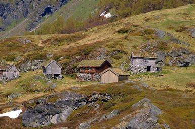 Keywords: norway fjordlandschaft mountains landscape nature hill spring holiday north grass green wooden huts residential structure vacation old dwelling accommodation