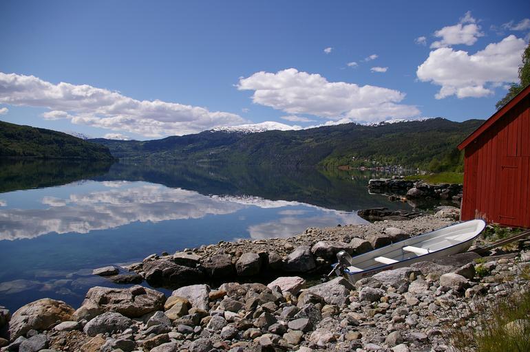 Keywords: norway holiday fish landscape water fjord boot boat shed nature waters stone mood impressions sky clouds bright cloud formation blue freedom clear travel swim