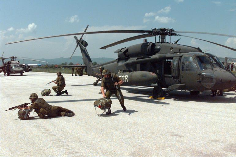 | Keywords: Norwegian mech battalion soldiers UH-60.jpg See caption The rifles are AG-3s a licence-produced copy of the Heckler Koch G3 ;Date 16 May 1997 ;Source http //www dodmedia osd mil ;Source's ID DFSD9901318 ;Original caption NORWEGIAN soldiers from the NORWEGIAN Mechanized Battalion Kongsberg Norway jump out of a UH-60 Black Hawk Blackhawk helicopter and get into fighting positions with their G3A4 rifles on the ground during a joint United States and NORWEGIAN rapid troop deployment training exercise ;Photographer SRA SEAN WORRELL PD-USGov Army of Norway UH-60 class helicopters KFOR Kosovo Force Military training AG-3 |