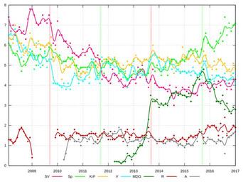 | Keywords: Norwegian Storting Monthly Party Polls, zoom.svg en What fraction of the population would vote for each party in a Norwegian Storting election based on monthly poll data from pollofpolls no starting from 2008 The vertical light red lines mark Storting elections while the light green ones mark local elections The x axis is the year and the y axis is the popularity in percent This is a zoom on the smaller parties - the three largest ones Ap H and Frp are all off the scale in this plot 2016-12-29 own Amaurea other versions cc-zero Statistical graphs Politics of Norway Stortinget |
