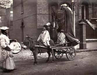 | Keywords: street_life_in_london streetlifeinlondon november 5th november5th guy fawkes guyfawkes effigy effigies cart donkey cross-dressing crossdressing guy fawke's night guyfawkesnight firework night fireworknight bonfire night bonfirenight london street performance streetperformance From 'Street Life in London', 1877, by John Thomson and Adolphe Smith: "The accompanying photograph is that of a nondescript guy, somewhat clumsily built up by a costermonger who lives in the south-east of London. This meaningless monstrosity, together with the absurd appearance of the man in woman's clothes, amuses some persons, and the conductor of such an exhibition can hope to realize about thirty shillings the first day, a pound on the 6th of November, and ten or fifteen shillings on the 7th. With this money the cost of getting up the guy must be refunded, and a shilling or eighteen pence per day given to the boys who help to swell the cortege. The boys' share of the proceeds is consequently somewhat out of proportion with the time and cheers they devote to promoting the success of the enterprise; but it is argued that they enjoy the fun, while to their seniors the venture is attended with some risk, and is only considered as another form of labour for daily bread." For the full story, and other photographs and commentaries, follow this link and click through to the PDF file at the bottom of the description archives.lse.ac.uk/Record.aspx?src=CalmView.Catalog&i... From 'Street Life in London', 1877, by John Thomson and Adolphe Smith: "The accompanying photograph is that of a nondescript guy, somewhat clumsily built up by a costermonger who lives in the south-east of London. This meaningless monstrosity, together with the absurd appearance of the man in woman's clothes, amuses some persons, and the conductor of such an exhibition can hope to realize about thirty shillings the first day, a pound on the 6th of November, and ten or fifteen shillings on the 7th. With this money the cost of getting up the guy must be refunded, and a shilling or eighteen pence per day given to the boys who help to swell the cortege. The boys' share of the proceeds is consequently somewhat out of proportion with the time and cheers they devote to promoting the success of the enterprise; but it is argued that they enjoy the fun, while to their seniors the venture is attended with some risk, and is only considered as another form of labour for daily bread." For the full story, and other photographs and commentaries, follow this link and click through to the PDF file at the bottom of the description archives.lse.ac.uk/Record.aspx?src=CalmView.Catalog&i... |