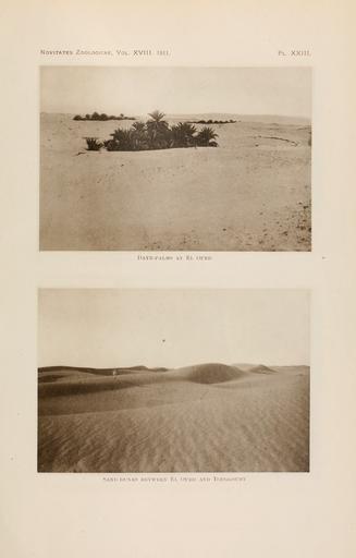 | Keywords: NovitatesZoologicae18 Pl23.png en Above Date Palm plantings in the oasis of El Oued Algeria<br /> Below Sand dunes between El Oued and Touggourt Algeria Novitates Zoologicae http //www archive org/details/novitateszoologi18lond Volume 18 Plate 23 6-11 April 1909 upper photo taken 4-7 or 10-13 April 1909 lower photo taken 1912 published Walter Rothschild Ernst Hartert K Jordan editors PD-old-100 Novitates Zoologicae - volume 18 Nature of Algeria Flora of Algeria Flora of South Algeria El Oued French Algeria Phoenix dactylifera illustrations Dunes of Algeria 1909 photographs Algeria in the 1900s |
