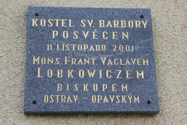 Keywords: Nový kostel sv. Barbory - deska 2.JPG cs Deska na budově Nového kostela sv Barbory Karviná-Louky own Hellooo 2013-06-10 New Church of Saint Barbara Louky nad Olší Plaques in Karviná District