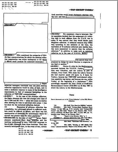 | Keywords: NSALibertyReport.p13.jpg A typical classified document Page 13 of a top secret en U S National Security Agency report http //www nsa gov/liberty/liber00010 pdf on the en USS Liberty incident partially declassified and released to the public in July 2003 PD-USGov USS Liberty AGTR-5 United States secrecy routine Documents in English |