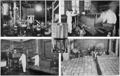 | Keywords: NSRW Dairy Industry 8.jpg en <small>Copyright by Brown Bros </small> The cream cooler we see in the center of the picture The cream flows on the outside of the cooler in which is ice cold brine Thence it flows into cans which are carried to the bottling department or if butter is wanted to the churning department In the upper right-hand corner is a machine for steaming bottles The bottles are thus thoroughly cleaned and sterilized and are ready for filling In the lower left-hand corner we see men filling bottles by machinery In the lower right-hand corner is the packing room In the background is the bottling machine where men are filling bottles and in the foreground are boxes filled with bottles ready for shipment the Pasteurizer the milk is run to the separator shown in the upper left-hand corner In this machine by centrifugal or whirling force the cream is separated from the milk The separator is the machine in the center of the picture Skimmed milk comes out through the spout of the tube at the left and is forced by the pump seen at the left up into a tank in the receiving room The cream comes out through the spout at the right and is pumped through the pipe at the right to the cream cooler <p>Next >> Image LA2-NSRW-3-0231 jpg Milk processing Centrifugal separators Cream Skimmed milk Bottle filling |