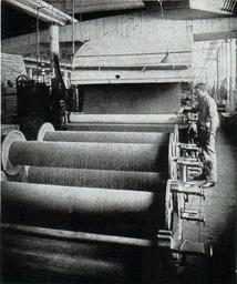 | Keywords: NSRW Story of Wool - slashing machine.jpg en SLASHING MACHINE This is a machine for sizing the threads In a slasher the threads from a number of warping beams are first combined into one sheet and then plunged into a trough filled with size which is kept at a boiling temperature and next squeezed between two pairs of rollers The sheet of yarn almost encircles two steam-heated cylinders This quickly dries the yarn The yarn is next measured passed above and below rods which separate the threads which are wound upon a loom beam The New Student's Reference Work v 5 1914 Story of Wool narrative between pp 2108 and 2109 third page Underwood Underwood published 1914 PD-US LA2-NSRW-5-0123 jpg Underwood Underwood Woollen mills |
